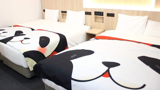 ベッドからお部屋の飾りまで全てパンダづくしのこちらのお部屋。シングルベッド2台、ダブルベッド1台で定員4名(添い寝含めると7名)まで泊まれます。