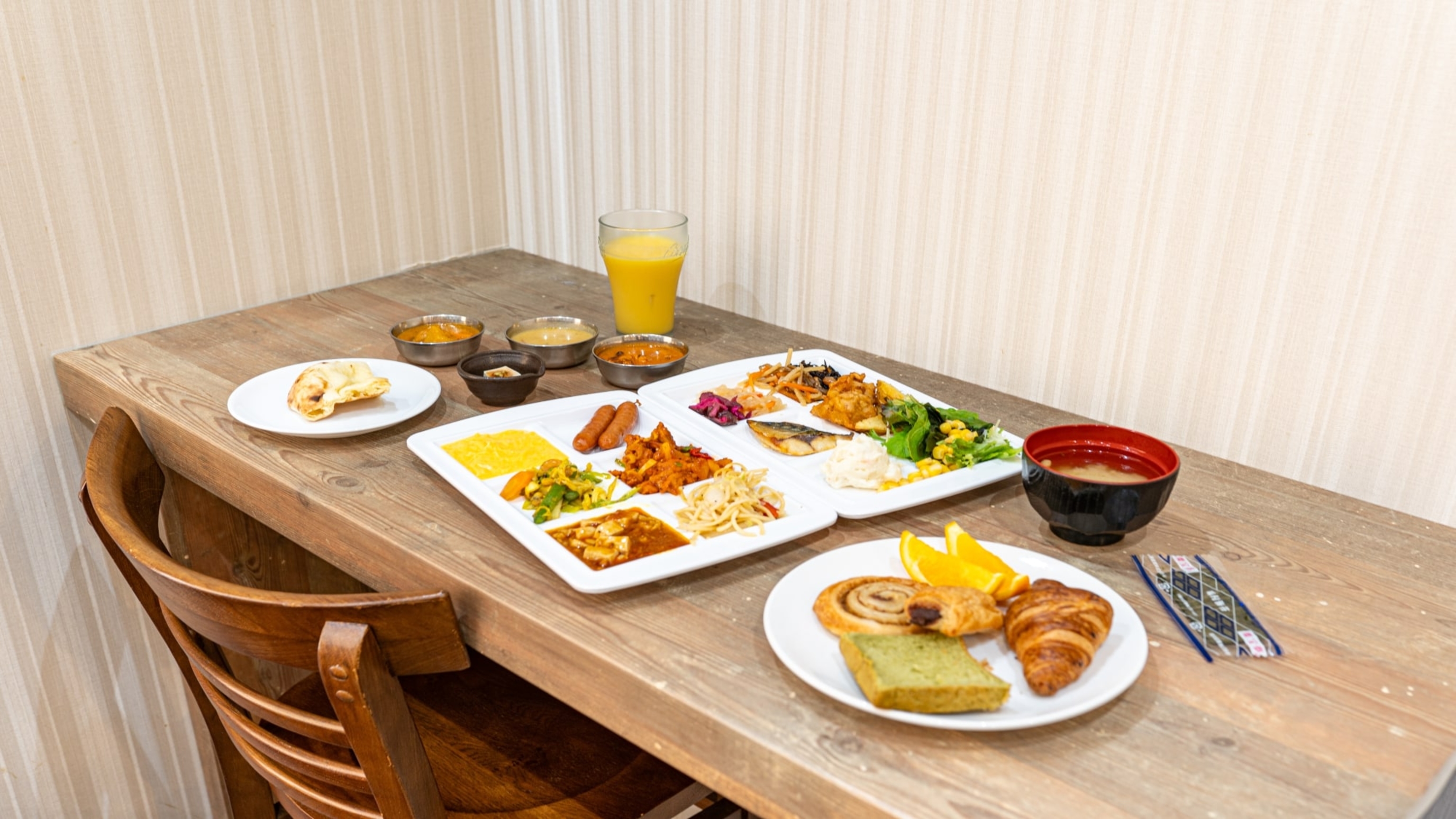 フロント階のレストランでは朝食の提供もしています。ラインナップとしては、和洋の他、インドカレーやラッシーなどが提供されているそうです。